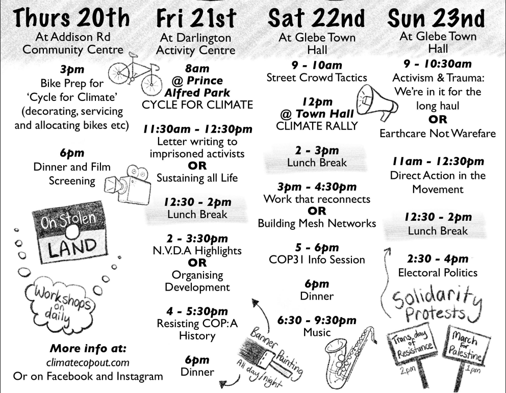Climate COP-Out is a grassroots climate action event. It is back this November 2025 from Thurs 20th - Sun 23rd in Warrung, on Gadigal Land (Sydney). It is held in response to the UN Conference Of the Parties (C.O.P) climate summit in Brazil, between 10 - 21 Nov. We will gather together and challenge the idea that this UN global climate summit is any solution to the crisis we are in.Now in its third year in Sydney, Climate COP-Out is laying an important base for huge movement potential if COP31 (2026) is hosted in Australia. Compiled of protest actions, workshops, discussion spaces and music, it aims to posit community led resistance and solutions to the state and corporation caused climate crisis.
